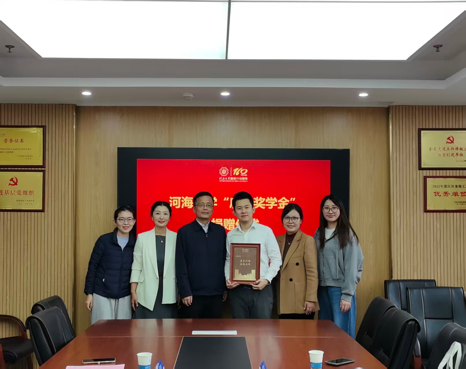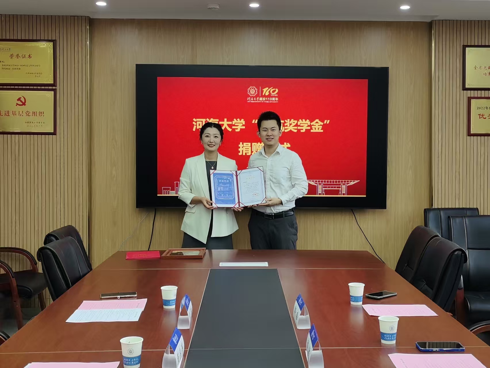 10月26日上午,河海大学外国语学院“启航奖学金”捐赠仪式在西康路校区举行。外国语学院2014届英语专业校友郭航、校友代表易梦成、郭瑶,学院党委书记笪学军,国内发展合作处副处长、教育基金会办公室副主任李维出席仪式。仪式由学院党委副书记、副院长王璐主持。